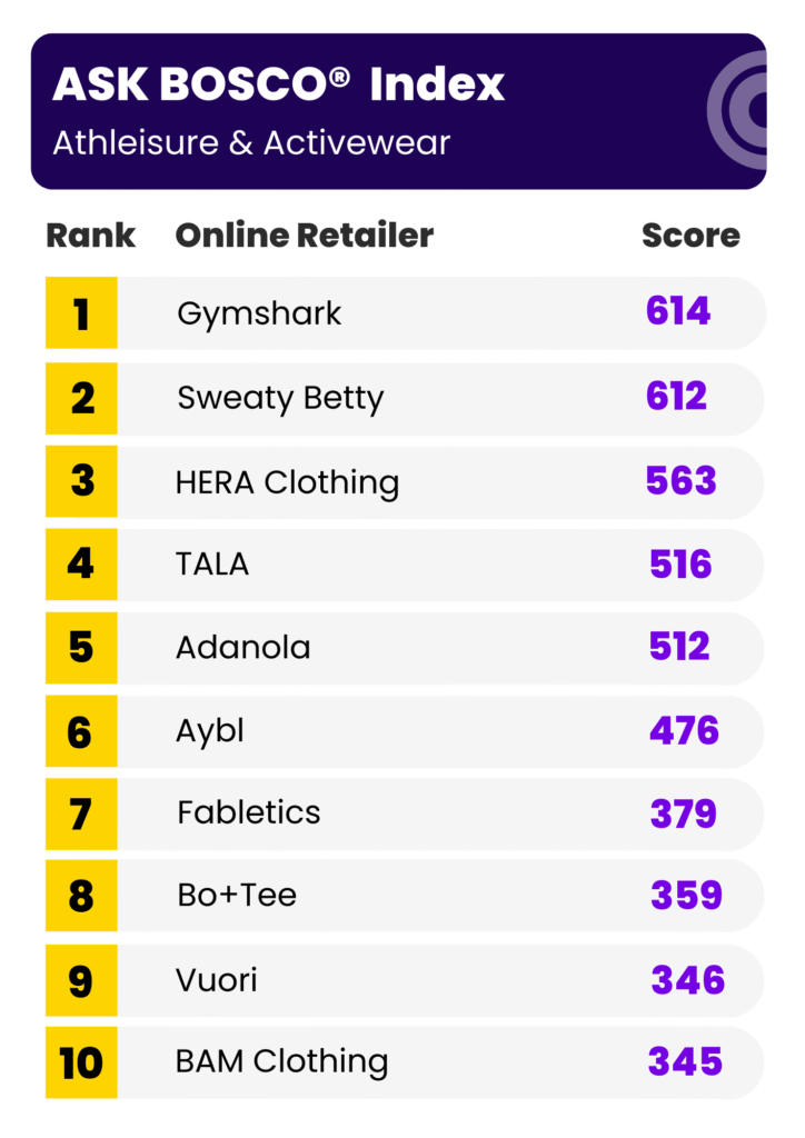 TLDR: Athleisure is thriving and competitive, driven by social media and a demand for versatile, high-quality, everyday clothing. Customer acquisition costs and low loyalty make innovation essential in this industry. The ASK BOSCO® Index scores brands on digital performance, with Gymshark ranking first for innovation and community-led growth, and Sweaty Betty close behind with purpose-driven campaigns, AI personalisation, and strong sustainability.