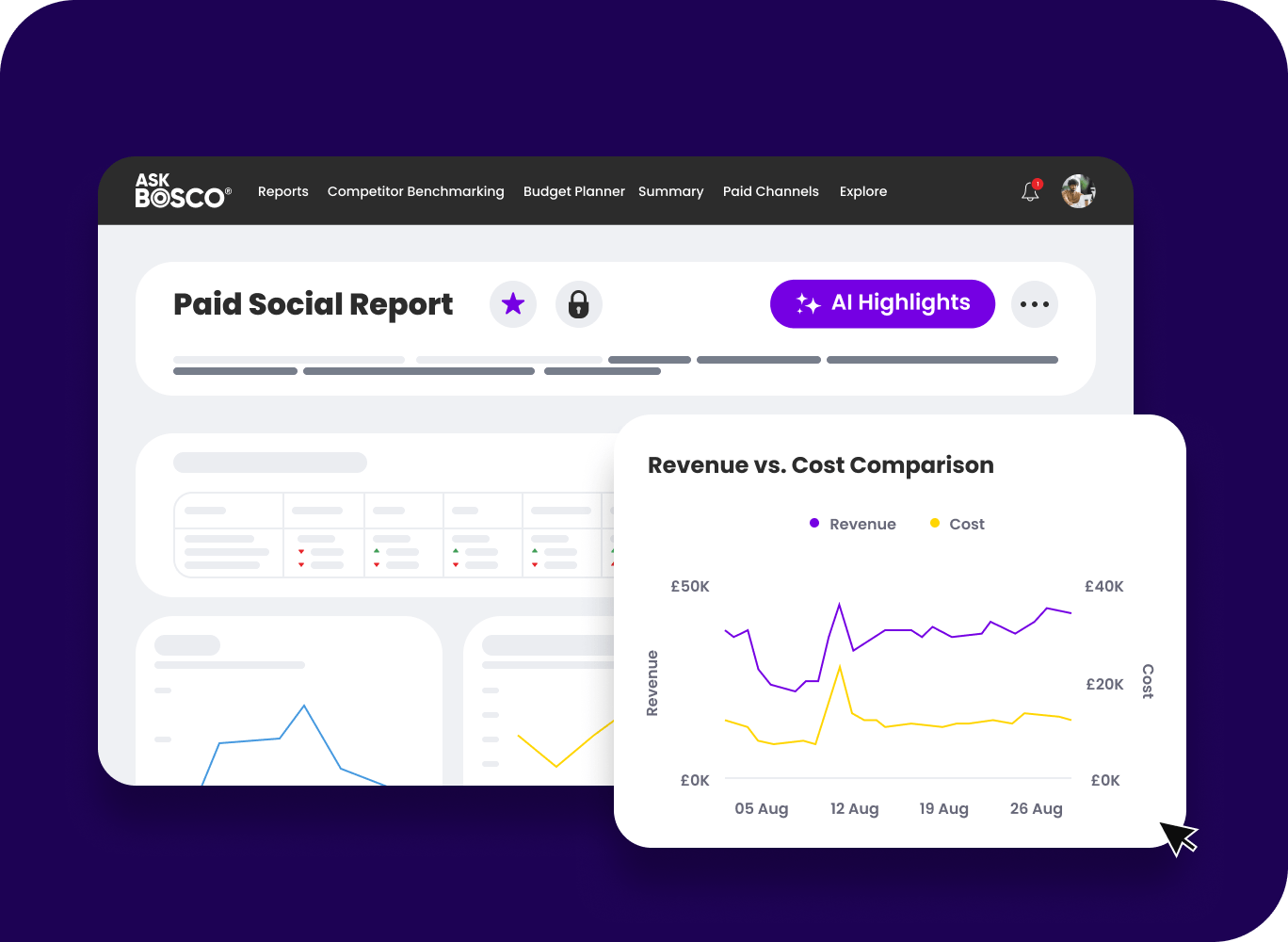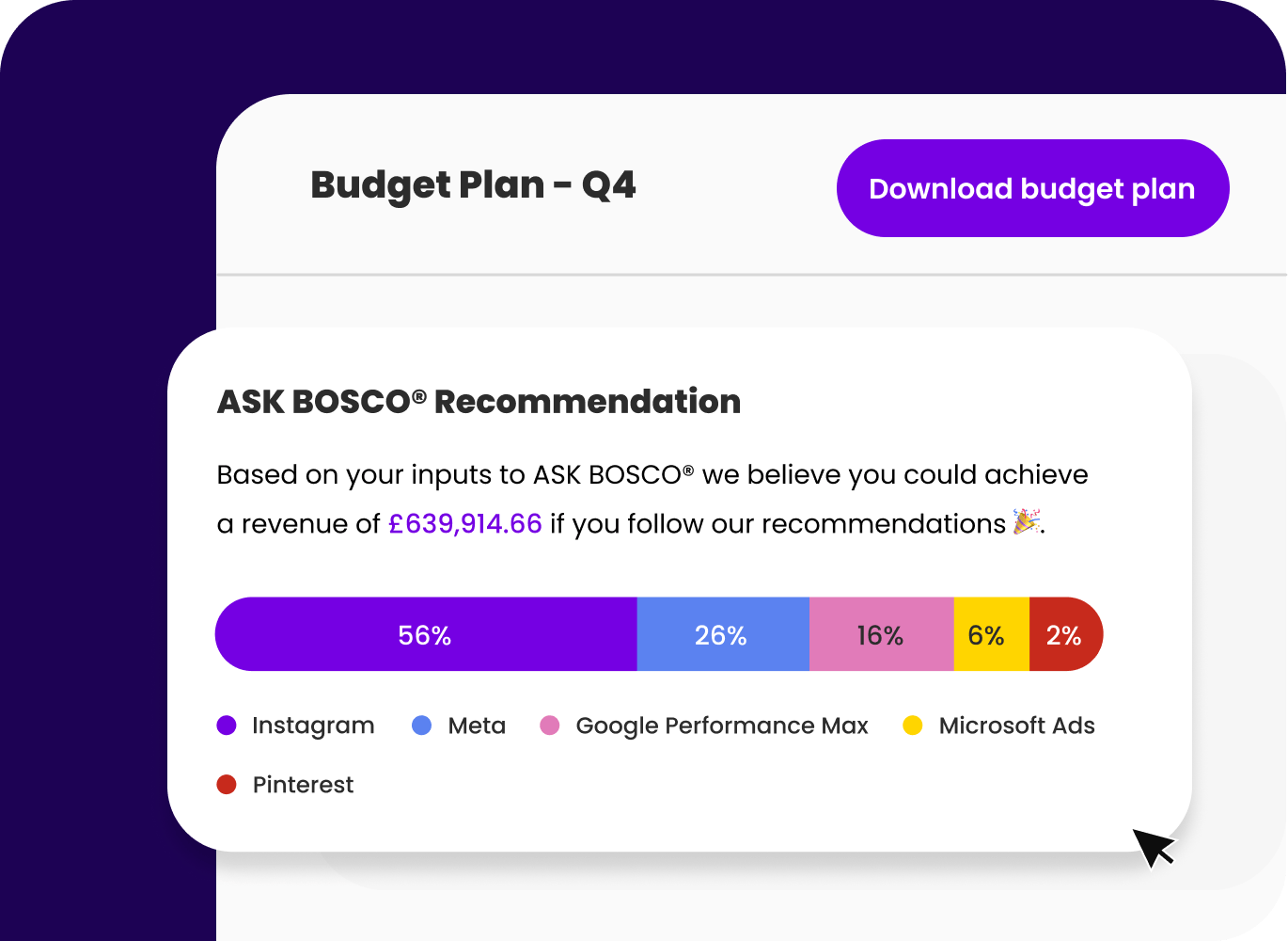 ASK BOSCO® suggests where to allocate or reallocate budgets for maximum impact, across all your social media channels, ensuring you’re not overspending on underperforming campaigns or underspending on high-potential ones.